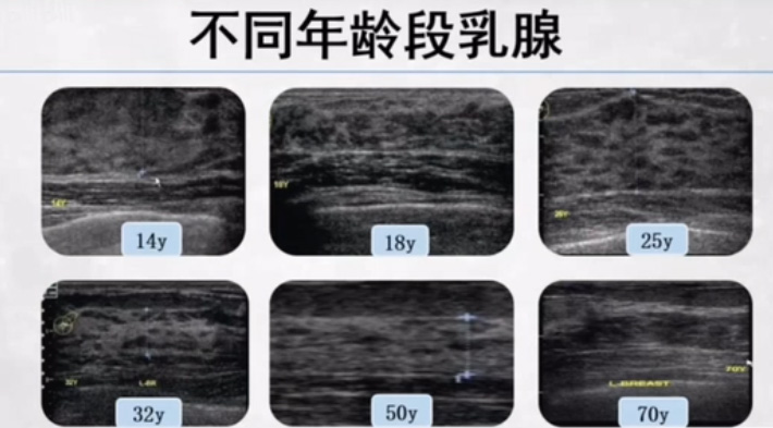 不同年齡段乳腺的超聲表現(xiàn),隨著年齡增長而異。取決于內(nèi)部的脂肪纖維和腺體組織的多少。