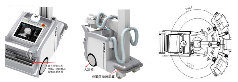2.寬廣攝影區(qū)域球管可圍繞立柱旋轉(zhuǎn)士325°,攝影無死角,最大化減主機(jī)的移動(dòng),確定窄的病房內(nèi)簡便、快捷地進(jìn)行工作。